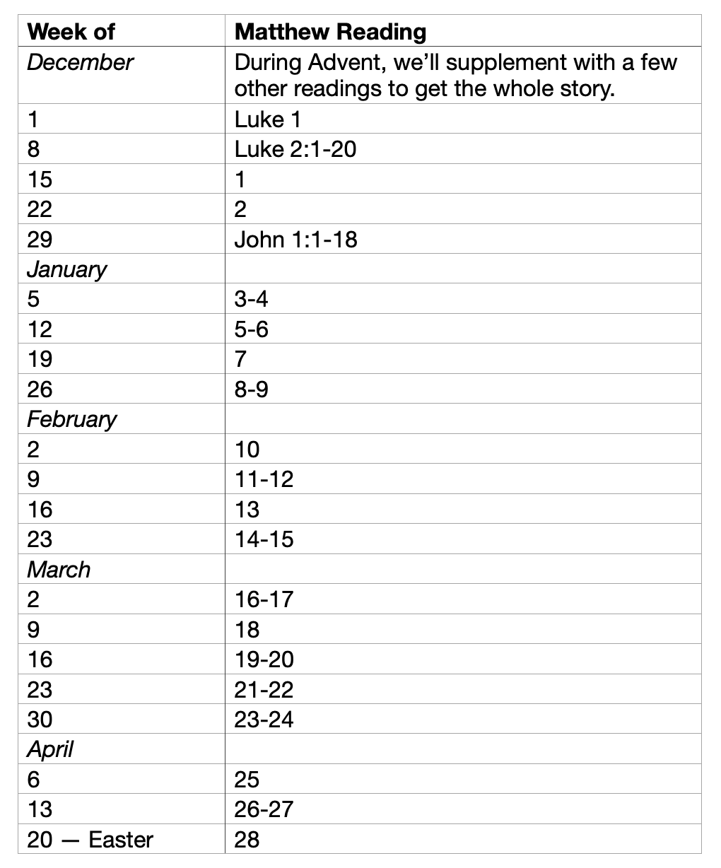 Hey teens, I've got a plan. I'd like us to read through the book of Matthew over the next four months. I'll send your reading assignments every Monday along with a few questions to think about as you read. When we're together, we discuss the chapters we've been reading. I'm timing the readings so that we can start now, and then end at Easter. (Makes good sense right? Since the book begins with Jesus' birth and ends with his resurrection.) So stay tuned for your first reading!